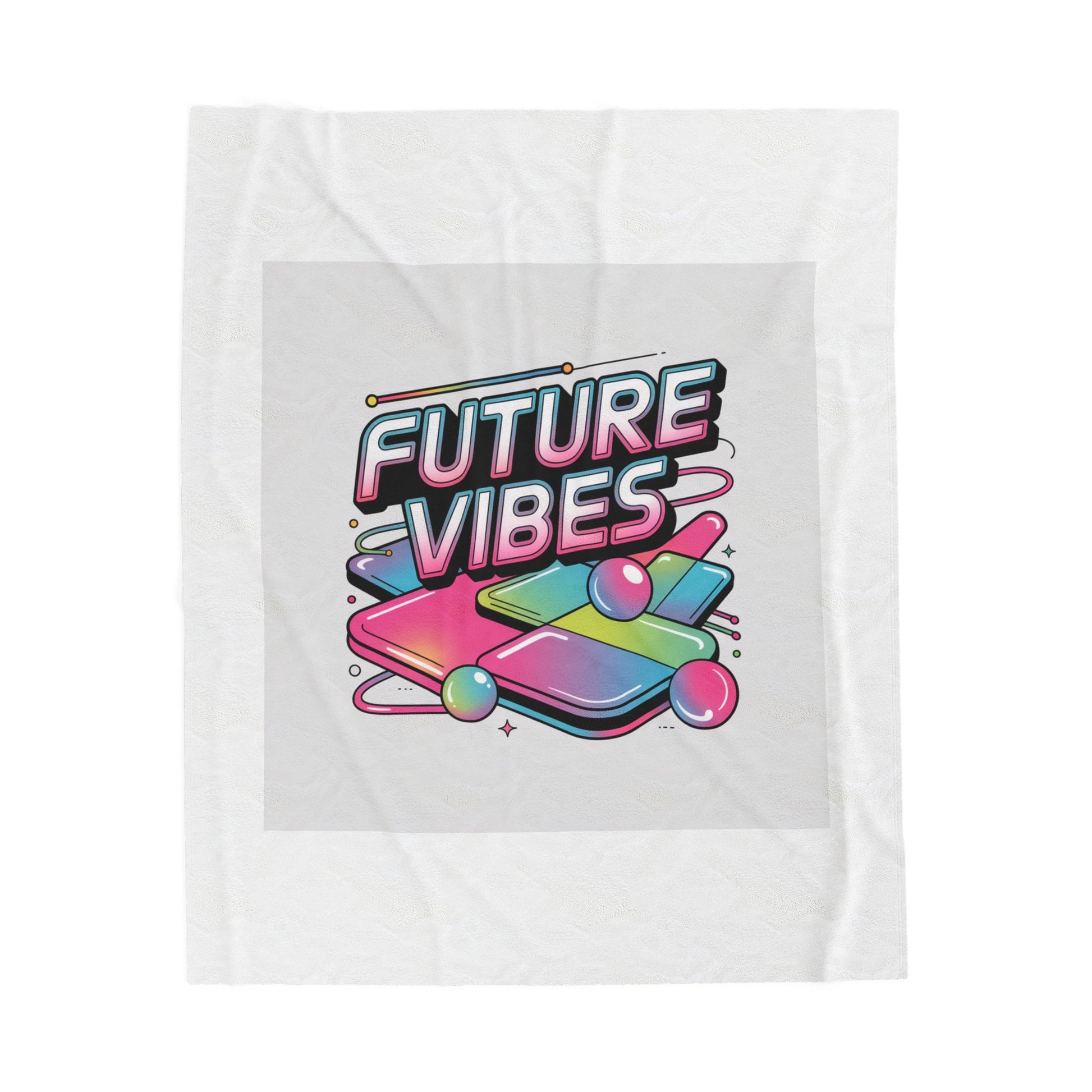 Soft velveteen blanket featuring a glossy Y2K-inspired graphic of chrome-style bubble lettering and holographic color shifts—“Future Vibes” sits above layered retro-tech shapes and floating spheres for a playful, cyber holo mood. The artwork’s luminous palette and chunky display type tap the Y2K cyber nostalgia trend, adding optimistic, tech-tinged flair to bedroom or lounge décor. Lightweight but plush, it works as a cozy throw while signaling early-2000s style and futuristic playfulness to trend-savvy shoppers.