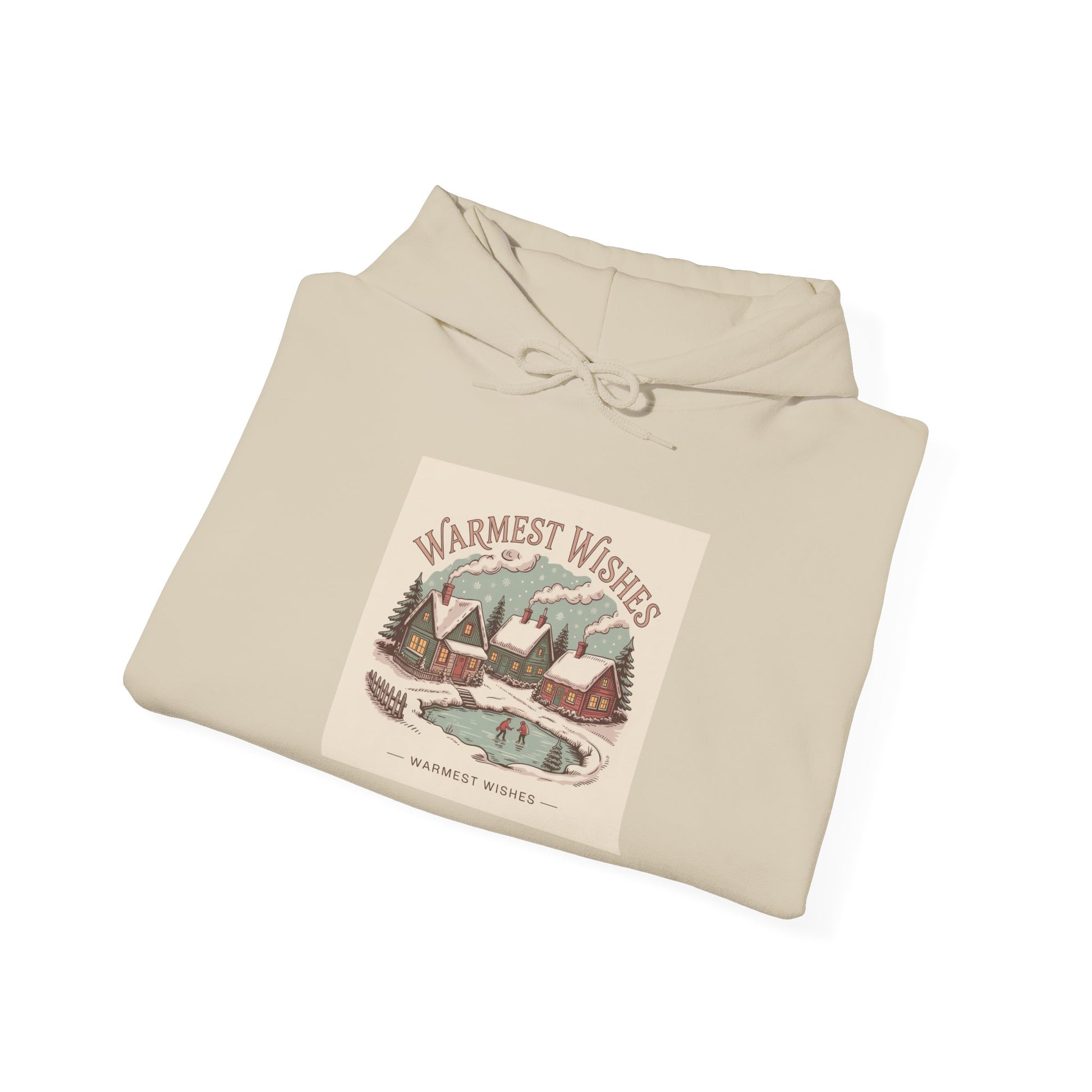 Vintage postcard–style winter scene printed on a cozy unisex heavy blend hoodie, evoking muted sepia tones and mid-century holiday typography. The artwork features a small village, snow-dusted roofs, and a short period serif greeting that reads like an old-fashioned holiday card, lending a sentimental, collectible feel for nostalgia-minded shoppers. The soft, slightly faded palette and grainy print work with the sweatshirt’s smooth fabric to create a warm, retro layering piece for cool-weather days.